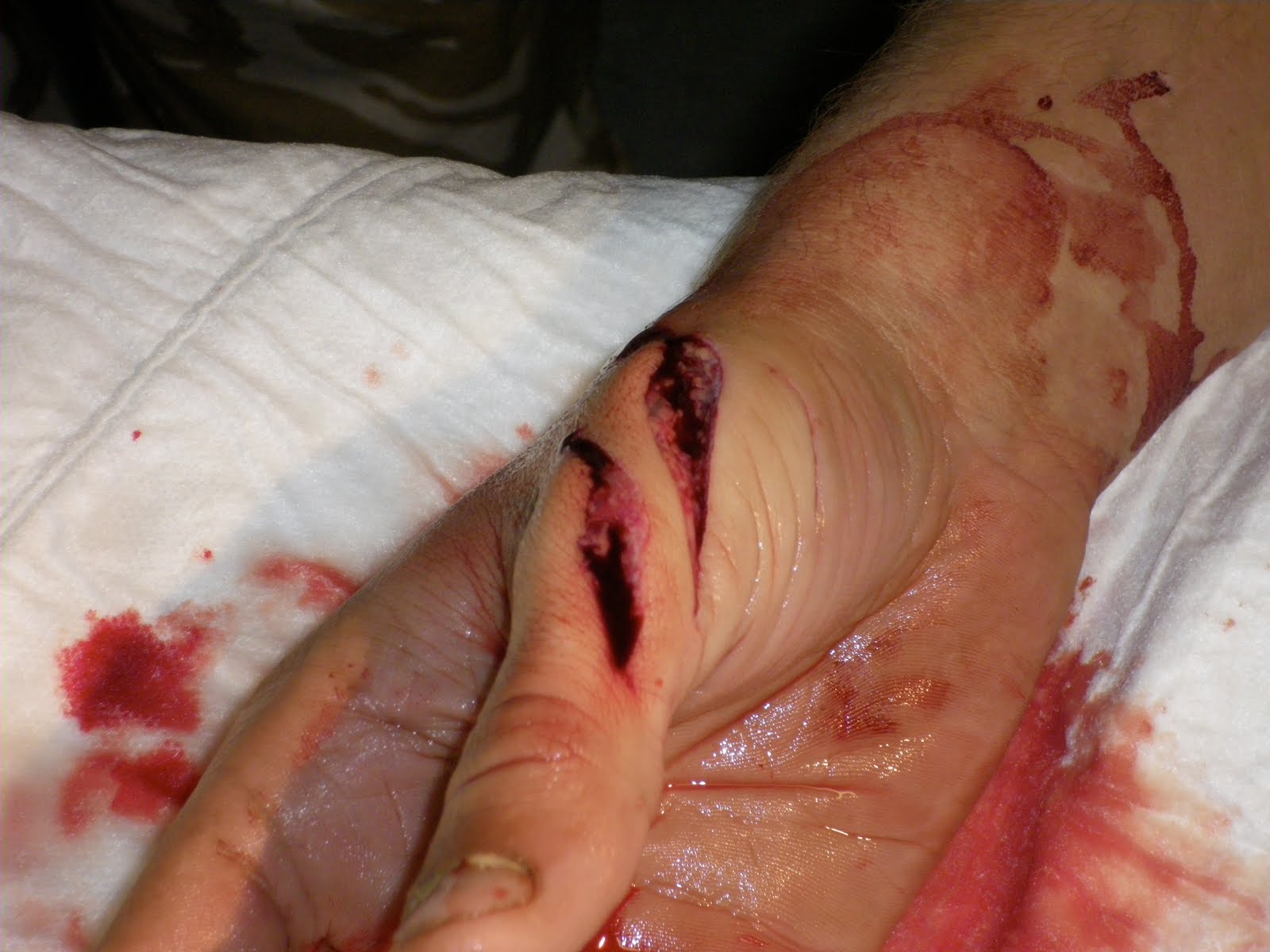 After putting on a blood pressure cuff to control bleeding and then washing, to get a better look at how deep the lacerations went. What you can't see as well in this picture is that the lac. only went to the subcutaneous fat. No tendons or musculature involved. Surprisingly.